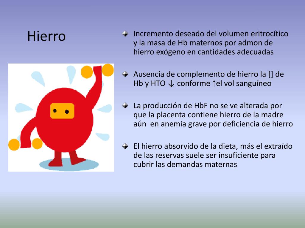 Hierro • Incremento deseado del volumen eritrocítico y la masa de Hb maternos por admon de hierro exógeno en cantidades adecuadas • Ausencia de complemento de hierro la [] de Hb y HTO ↓ conforme el volsanguíneo • La producción de HbF no se vealteradaporque la placenta contienehierro de la madreaún en anemia grave pordeficiencia de hierro • El hierro absorvido de la dieta, más el extraído de las reservas suele ser insuficiente para cubrir las demandas maternas