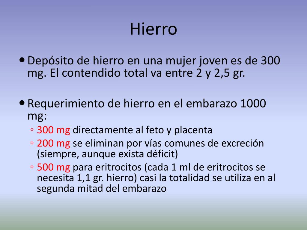 Hierro • Depósito de hierro en una mujer joven es de 300 mg. El contendido total va entre 2 y 2,5 gr. • Requerimiento de hierro en el embarazo 1000 mg: • 300 mg directamente al feto y placenta • 200 mg se eliminan por vías comunes de excreción (siempre, aunque exista déficit) • 500 mg para eritrocitos (cada 1 ml de eritrocitos se necesita 1,1 gr. hierro) casi la totalidad se utiliza en al segunda mitad del embarazo