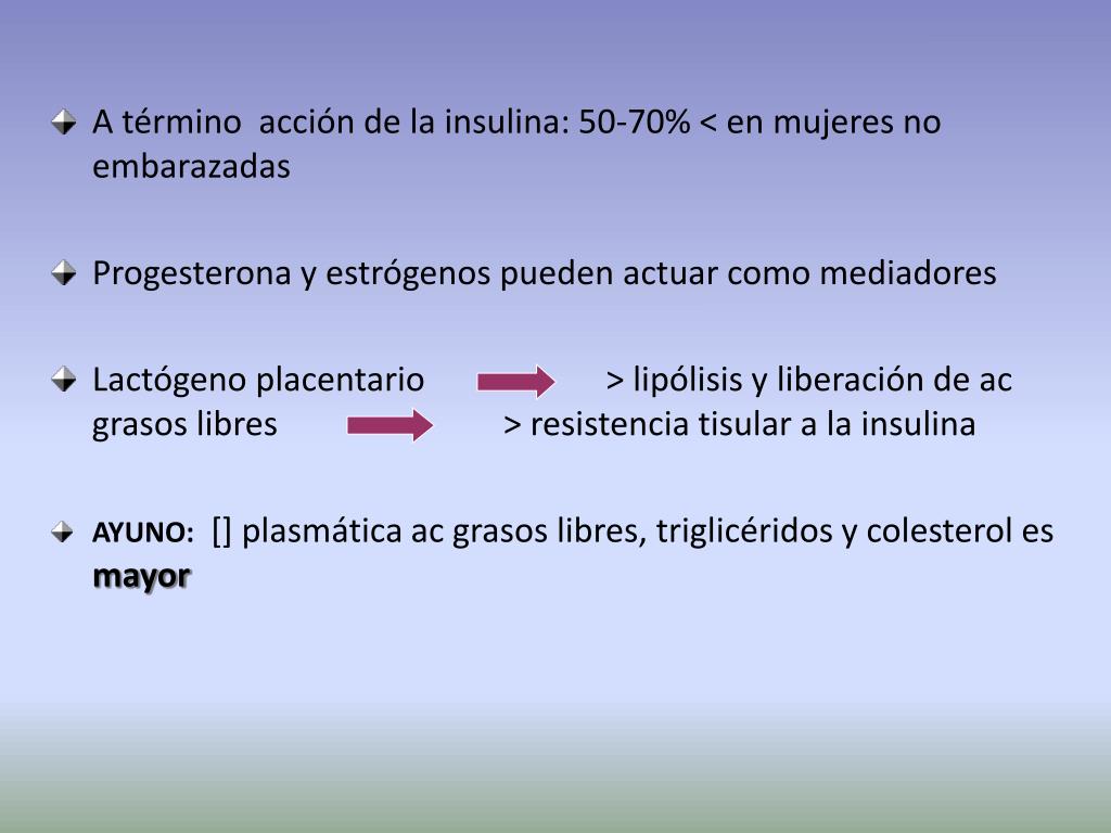 A término acción de la insulina: 50-70% < en mujeres no embarazadas • Progesterona y estrógenospuedenactuarcomomediadores • Lactógenoplacentario > lipólisis y liberación de ac grasoslibres > resistenciatisular a la insulina • AYUNO: [] plasmática ac grasoslibres, triglicéridos y colesterolesmayor