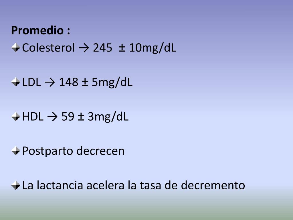 Promedio : • Colesterol → 245 ± 10mg/dL • LDL → 148 ± 5mg/dL • HDL → 59 ± 3mg/dL • Postparto decrecen • La lactancia acelera la tasa de decremento