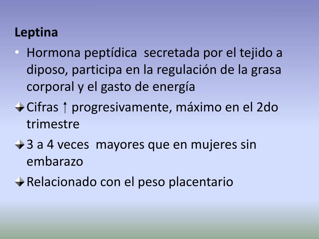 Leptina • Hormona peptídica secretada por el tejido a diposo, participa en la regulación de la grasa corporal y el gasto de energía • Cifras progresivamente, máximo en el 2do trimestre • 3 a 4 veces mayores que en mujeres sin embarazo • Relacionado con el peso placentario