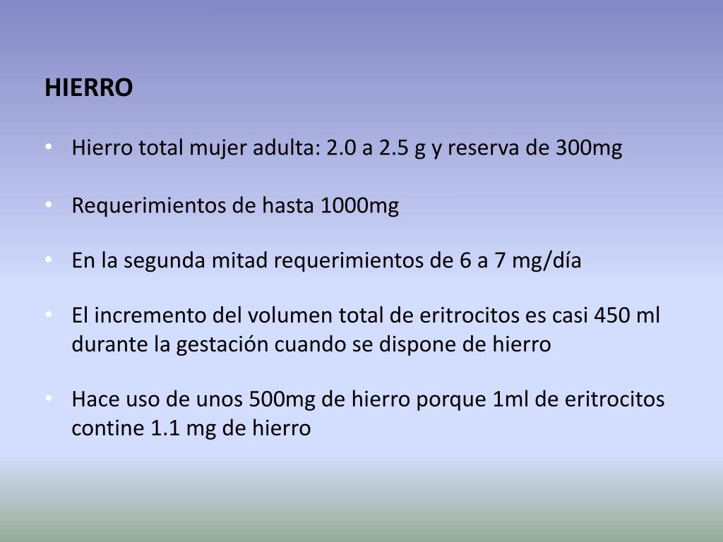 HIERRO • Hierro total mujer adulta: 2.0 a 2.5 g y reserva de 300mg • Requerimientos de hasta 1000mg • En la segunda mitad requerimientos de 6 a 7 mg/día • El incremento del volumen total de eritrocitos es casi 450 ml durante la gestación cuando se dispone de hierro • Hace uso de unos 500mg de hierro porque 1ml de eritrocitos contine 1.1 mg de hierro