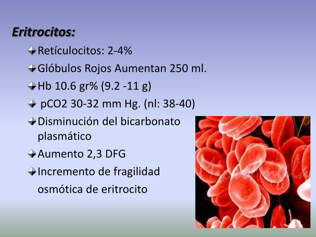 Eritrocitos: • Retículocitos: 2-4% • Glóbulos Rojos Aumentan 250 ml. • Hb 10.6 gr% (9.2 -11 g) • pCO2 30-32 mm Hg. (nl: 38-40) • Disminución del bicarbonato plasmático • Aumento 2,3 DFG • Incremento de fragilidad osmótica de eritrocito