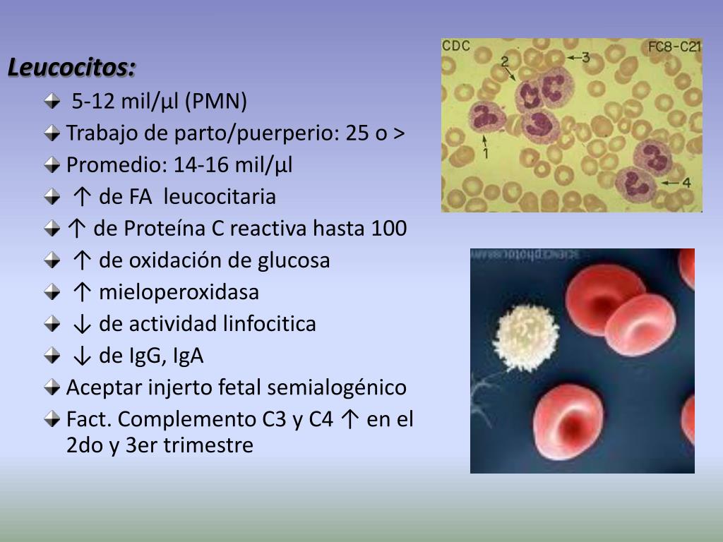 Leucocitos: • 5-12 mil/µl (PMN) • Trabajo de parto/puerperio: 25 o > • Promedio: 14-16 mil/µl • ↑ de FA leucocitaria • ↑ de Proteína C reactiva hasta 100 • ↑ de oxidación de glucosa • ↑mieloperoxidasa • ↓ de actividad linfocitica • ↓ de IgG, IgA • Aceptar injerto fetal semialogénico • Fact. Complemento C3 y C4 ↑ en el 2do y 3er trimestre