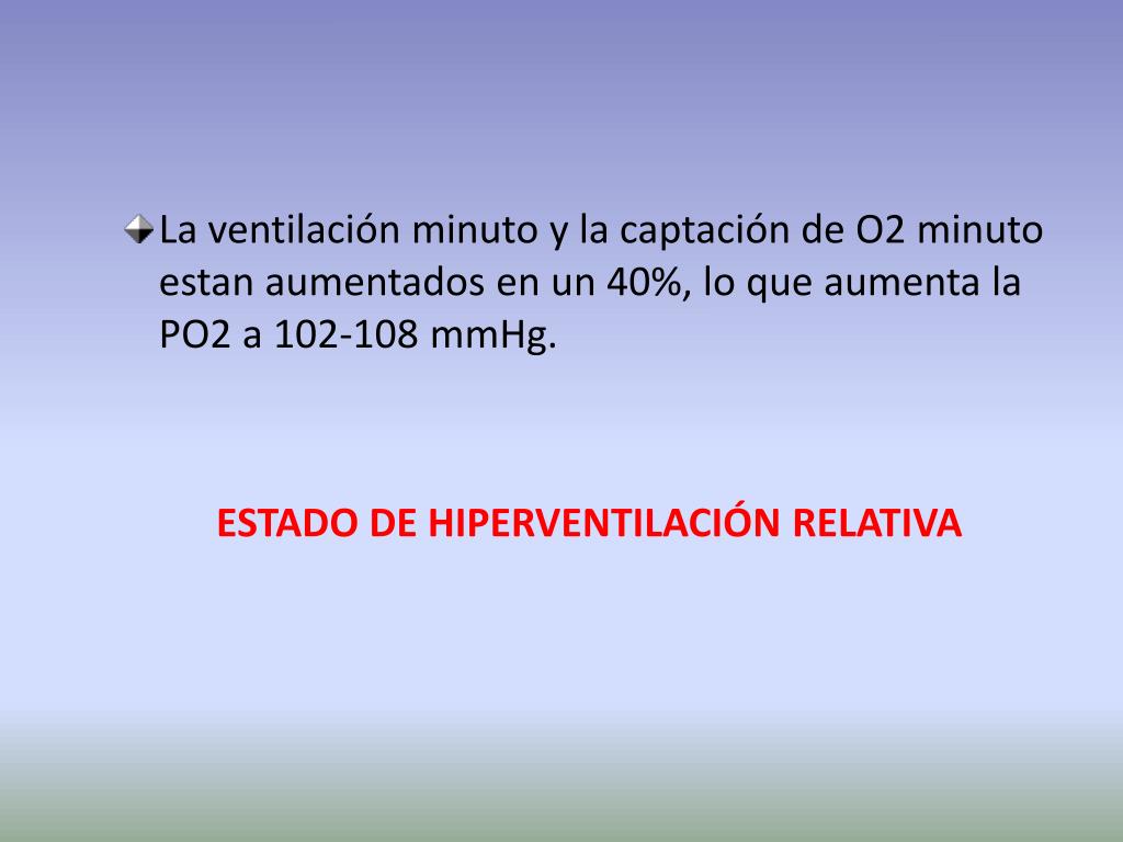 La ventilaciónminuto y la captación de O2 minutoestanaumentados en un 40%, lo queaumenta la PO2 a 102-108 mmHg. ESTADO DE HIPERVENTILACIÓN RELATIVA