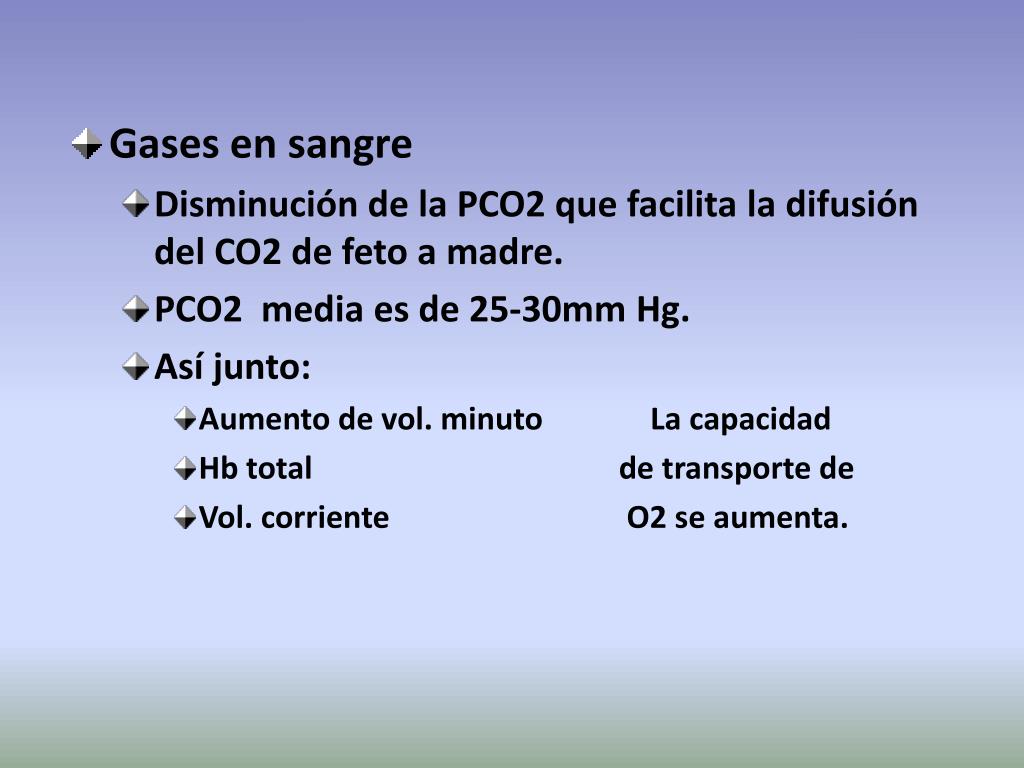 Gases en sangre • Disminución de la PCO2 quefacilita la difusión del CO2 de feto a madre. • PCO2 media es de 25-30mm Hg. • Asíjunto: • Aumento de vol. minuto La capacidad • Hb total de transporte de • Vol. corriente O2 se aumenta.