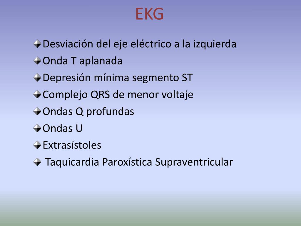 EKG • Desviación del eje eléctrico a la izquierda • Onda T aplanada • Depresión mínima segmento ST • Complejo QRS de menor voltaje • Ondas Q profundas • Ondas U • Extrasístoles • Taquicardia Paroxística Supraventricular