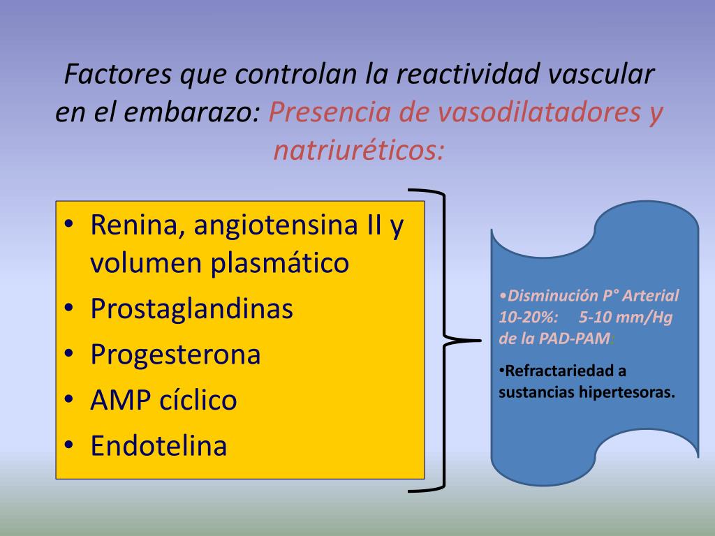 Factores que controlan la reactividad vascular en el embarazo: Presencia de vasodilatadores y natriuréticos: • Renina, angiotensina II y volumen plasmático • Prostaglandinas • Progesterona • AMP cíclico • Endotelina • Disminución P° Arterial 10-20%: 5-10 mm/Hg de la PAD-PAM: • Refractariedad a sustancias hipertesoras.