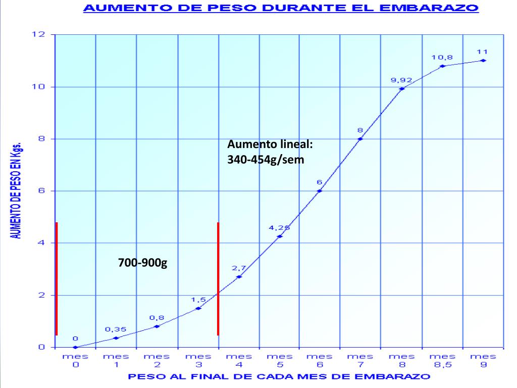 Aumento de peso • Debido a: • útero y sucontenido • mamas, • ↑ volsanguíneo y líquidoextravascular • depósito de grasas • Promedio: de 12.5 kg • Al final (semana 40) la unidadfetopalcentariaesresponsable de 1/3 parte del aumento de peso total