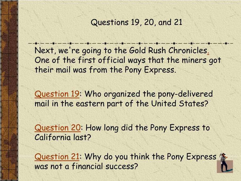 Questions 19, 20, and 21 Next, we're going to the Gold Rush Chronicles.One of the first official ways that the miners got their mail was from the Pony Express. Question 19: Who organized the pony-delivered mail in the eastern part of the United States? Question 20: How long did the Pony Express to California last?Question 21: Why do you think the Pony Express was not a financial success?