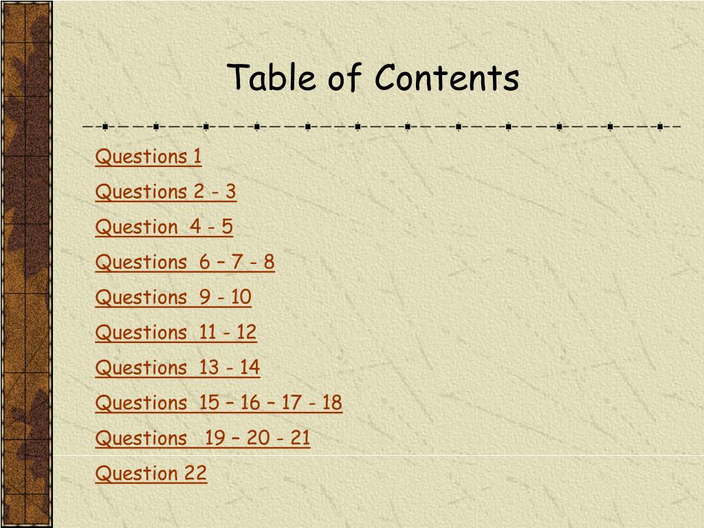 Table of Contents Questions 1 Questions 2 - 3 Question 4 - 5 Questions 6 – 7 - 8 Questions 9 - 10 Questions 11 - 12 Questions 13 - 14 Questions 15 – 16 – 17 - 18 Questions 19 – 20 - 21 Question 22