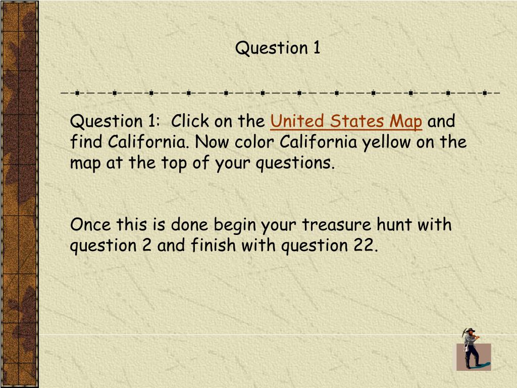 Question 1 Question 1: Click on the United States Map and find California. Now color California yellow on the map at the top of your questions. Once this is done begin your treasure hunt with question 2 and finish with question 22.