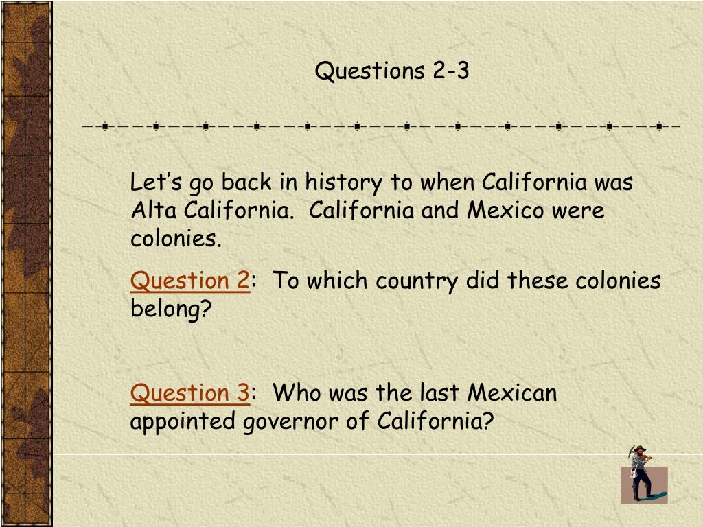Questions 2-3 Let’s go back in history to when California was Alta California. California and Mexico were colonies. Question 2: To which country did these colonies belong? Question 3: Who was the last Mexican appointed governor of California?