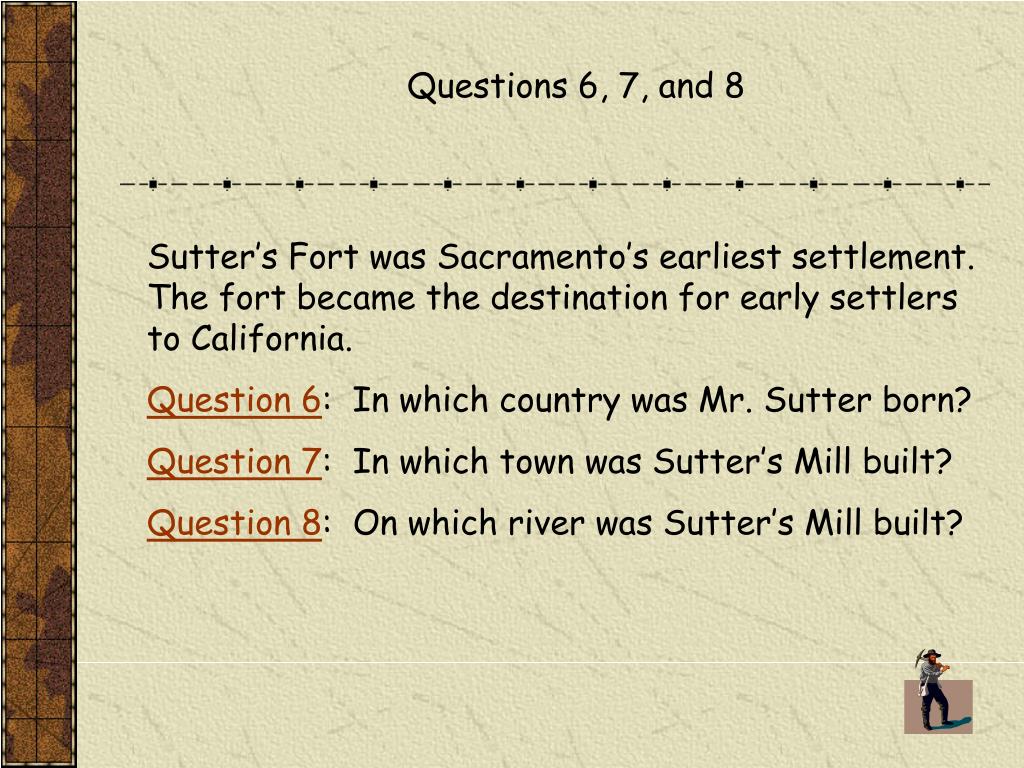 Questions 6, 7, and 8 Sutter’s Fort was Sacramento’s earliest settlement. The fort became the destination for early settlers to California. Question 6: In which country was Mr. Sutter born? Question 7: In which town was Sutter’s Mill built? Question 8: On which river was Sutter’s Mill built?