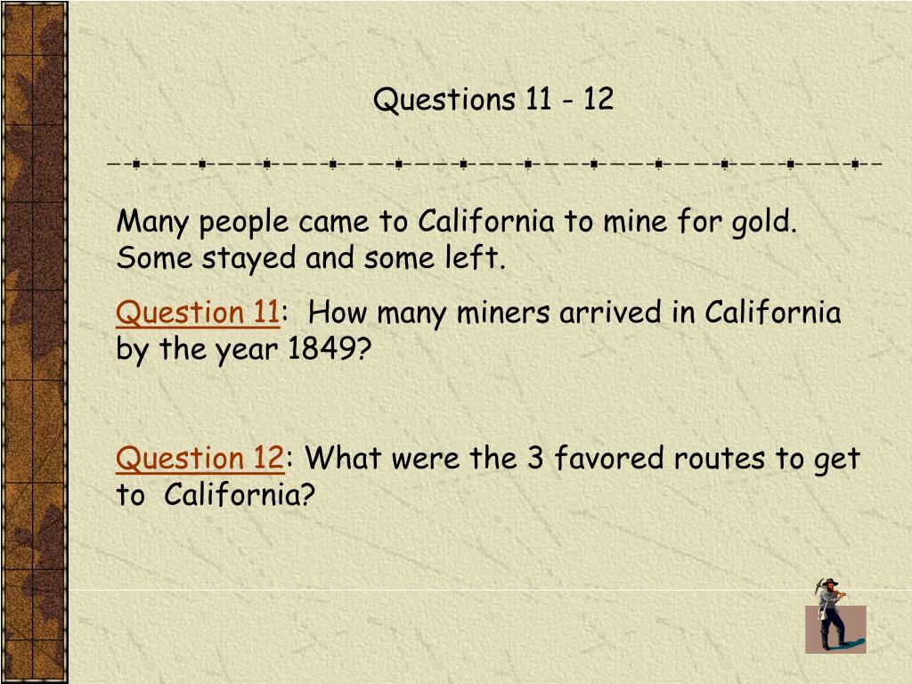 Questions 11 - 12 Many people came to California to mine for gold. Some stayed and some left. Question 11: How many miners arrived in California by the year 1849? Question 12: What were the 3 favored routes to get to California?