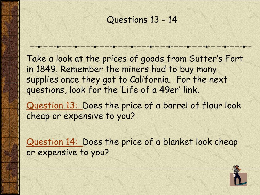 Questions 13 - 14 Take a look at the prices of goods from Sutter’s Fortin 1849. Remember the miners had to buy many supplies once they got to California. For the next questions, look for the ‘Life of a 49er’ link. Question 13: Does the price of a barrel of flour look cheap or expensive to you? Question 14: Does the price of a blanket look cheap or expensive to you?