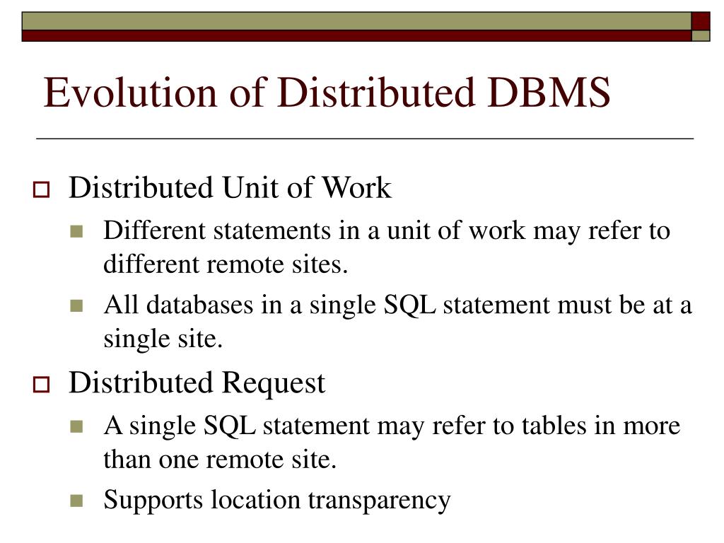 Evolution of Distributed DBMS • “Unit of Work” • All of a transaction’s instructions. • Remote Unit of Work • SQL statements originated at one location can be executed as a single unit of work on a single remote DBMS.