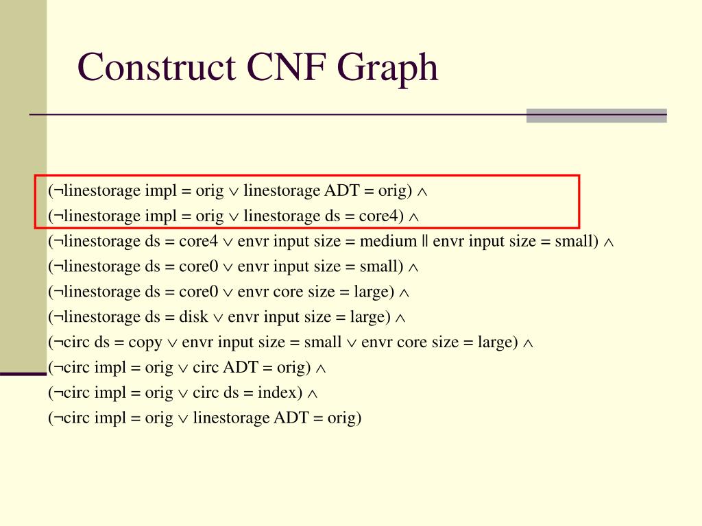 Construct CNF Graph (¬linestorage impl = orig linestorage ADT = orig) (¬linestorage impl = orig linestorage ds = core4) (¬linestorage ds = core4 envr input size = medium || envr input size = small) (¬linestorage ds = core0 envr input size = small) (¬linestorage ds = core0 envr core size = large) (¬linestorage ds = disk envr input size = large) (¬circ ds = copy envr input size = small envr core size = large) (¬circ impl = orig circ ADT = orig) (¬circ impl = orig circ ds = index) (¬circ impl = orig linestorage ADT = orig)