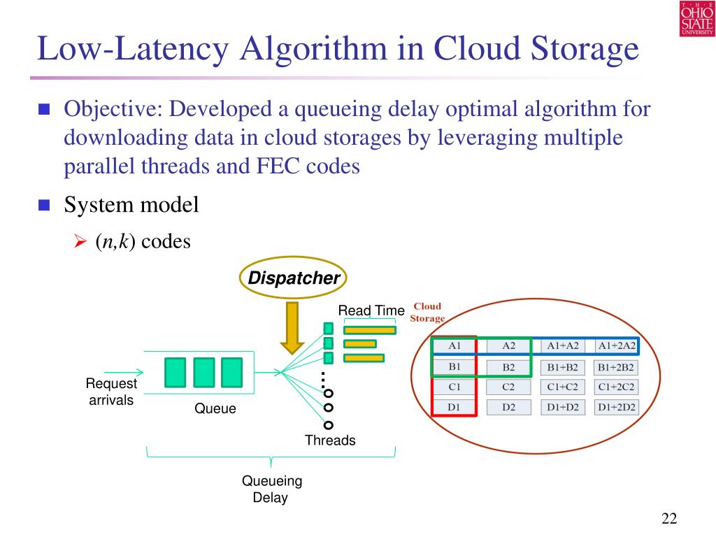Low-Latency Algorithm in Cloud Storage • Objective: Developed a queueing delay optimal algorithm for downloading data in cloud storages by leveraging multiple parallel threads and FEC codes • System model • (n,k) codes Dispatcher Read Time … Threads Request arrivals Queue Queueing Delay