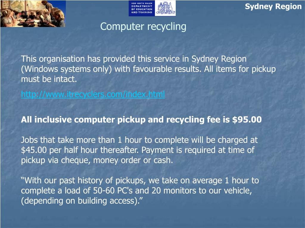 Sydney Region Computer recycling This organisation has provided this service in Sydney Region (Windows systems only) with favourable results. All items for pickup must be intact. http://www.itrecyclers.com/index.html All inclusive computer pickup and recycling fee is $95.00 Jobs that take more than 1 hour to complete will be charged at $45.00 per half hour thereafter. Payment is required at time of pickup via cheque, money order or cash. “With our past history of pickups, we take on average 1 hour to complete a load of 50-60 PC's and 20 monitors to our vehicle, (depending on building access).”