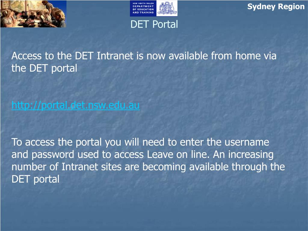 Sydney Region DET Portal Access to the DET Intranet is now available from home via the DET portal http://portal.det.nsw.edu.au To access the portal you will need to enter the username and password used to access Leave on line. An increasing number of Intranet sites are becoming available through the DET portal