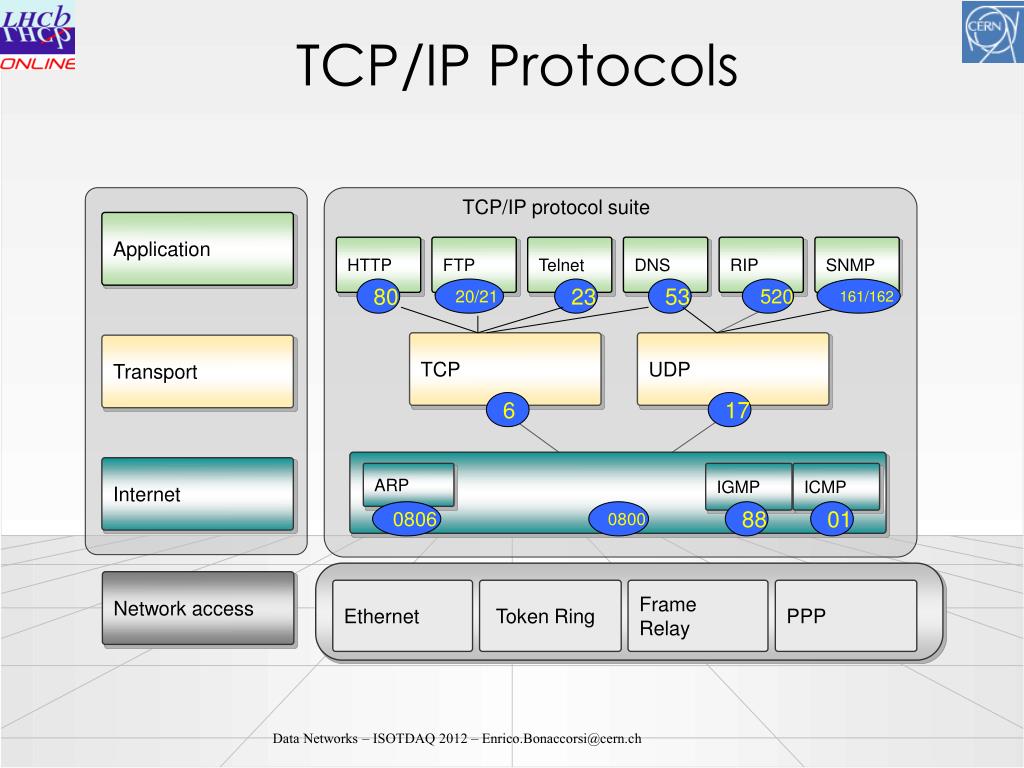 Data Networks. ISOTDAQ 2012 Enrico.Bonaccorsi@cern.ch. TCP/IP Protocols. TCP. UDP. IGMP. ICMP. Ethernet. Token Ring. Frame Relay. PPP. TCP/IP protocol suite. Application. HTTP. FTP. Telnet. DNS. RIP. SNMP. 80. 20/21. 23. 53. 520. 161/162. Transport. 6. 17. IP.
