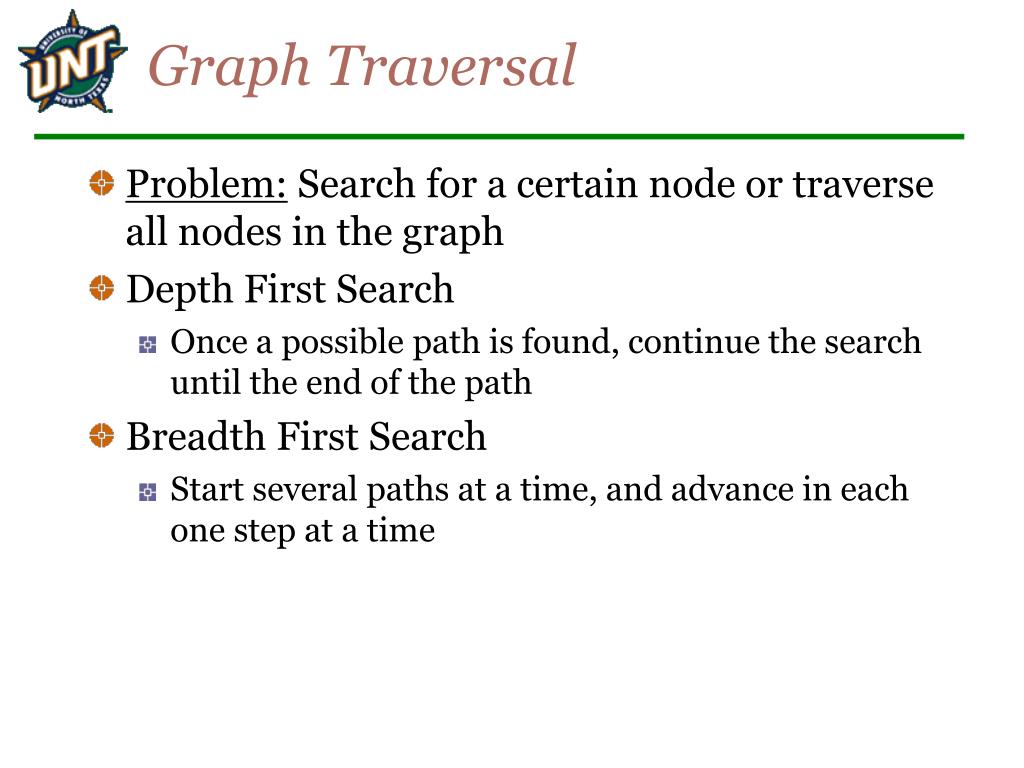 Graph Traversal • Problem: Search for a certain node or traverse all nodes in the graph • Depth First Search • Once a possible path is found, continue the search until the end of the path • Breadth First Search • Start several paths at a time, and advance in each one step at a time