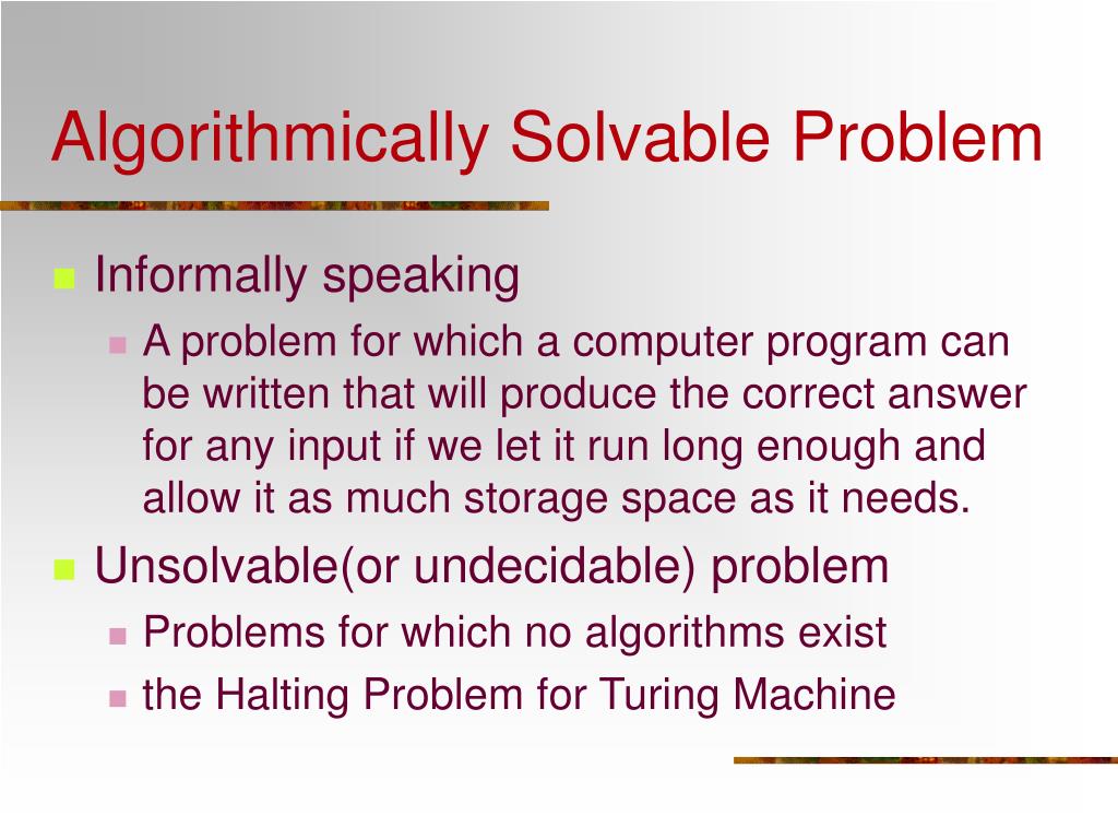 Algorithmically Solvable Problem • Informally speaking • A problem for which a computer program can be written that will produce the correct answer for any input if we let it run long enough and allow it as much storage space as it needs. • Unsolvable(or undecidable) problem • Problems for which no algorithms exist • the Halting Problem for Turing Machine