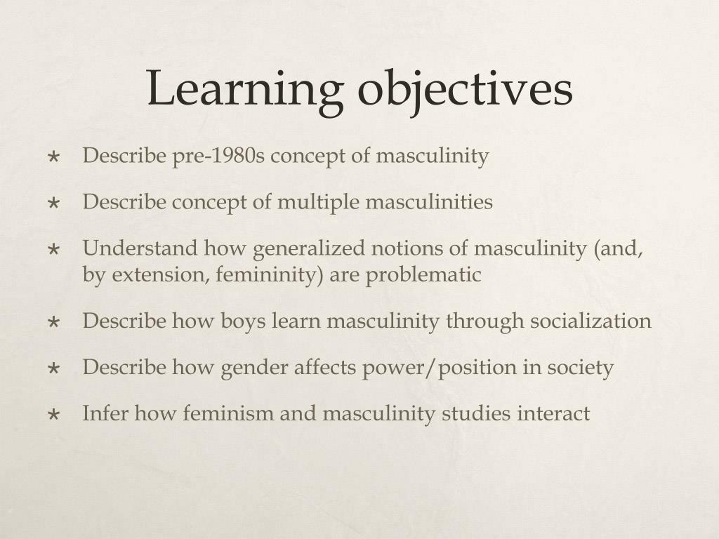 Learning objectives • Describe pre-1980s concept of masculinity • Describe concept of multiple masculinities • Understand how generalized notions of masculinity (and, by extension, femininity) are problematic • Describe how boys learn masculinity through socialization • Describe how gender affects power/position in society • Infer how feminism and masculinity studies interact