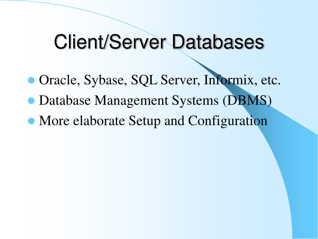 Client/Server Databases • Oracle, Sybase, SQL Server, Informix, etc. • Database Management Systems (DBMS) • More elaborate Setup and Configuration