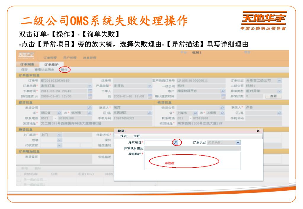 二级公司OMS系统失败处理操作 双击订单-【操作】-【询单失败】 -点击【异常项目】旁的放大镜,选择失败理由-【异常描述】里写详细理由