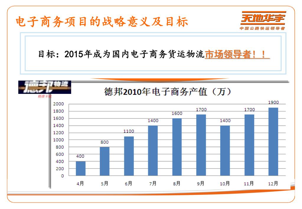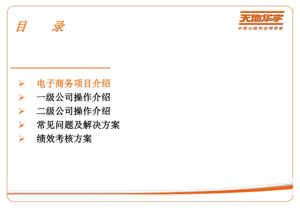 电子商务项目培训材料. 集团商务市场部. 目 录. 电子商务项目介绍 一级公司操作介绍 二级公司操作介绍 常见问题及解决方案 绩效考核方案. 什么是电子商务. 电子商务项目的战略意义及目标. 目标: 2015 年成为国内电子商务货运物流 市场领导者 !!. 精准卡航. 4. 电子商务项目业务介绍. 电子商务项目业务类型: 定日达. 1 、淘宝门到门收费标准 在起步重量范围内,收取起步价格,超过起步重量,按每公斤 累加 续重价格
