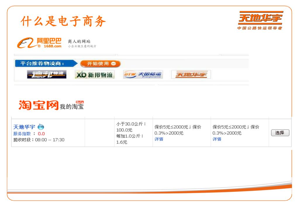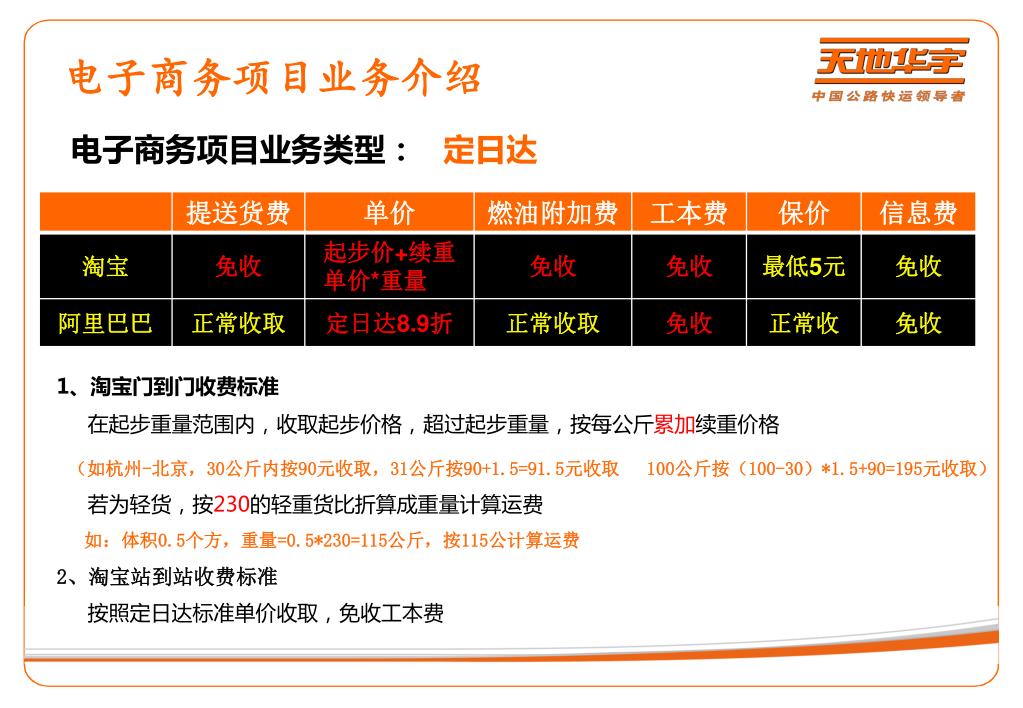 电子商务项目业务介绍 电子商务项目业务类型: 定日达 • 1、淘宝门到门收费标准 • 在起步重量范围内,收取起步价格,超过起步重量,按每公斤累加续重价格 (如杭州-北京,30公斤内按90元收取,31公斤按90+1.5=91.5元收取 100公斤按(100-30)*1.5+90=195元收取) 若为轻货,按230的轻重货比折算成重量计算运费 如:体积0.5个方,重量=0.5*230=115公斤,按115公计算运费 • 2、淘宝站到站收费标准 • 按照定日达标准单价收取,免收工本费