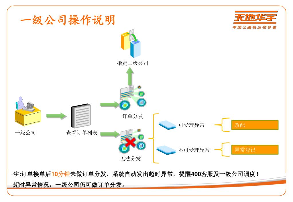 二级公司操作说明 失败 询单异常登记 揽收异常登记 递送异常登记 失败 失败 成功 成功 二级公司 查看订单列表 导入迪辰系统 产生运单 递送 询单(联系客户,确认信息) 揽货(收货) 成功 打印提货单 注:订单接单后10分钟未做询单,系统自动发出超时异常,提醒400客服及二级公司客服! 超时异常情况,二级公司仍可做询单操作。
