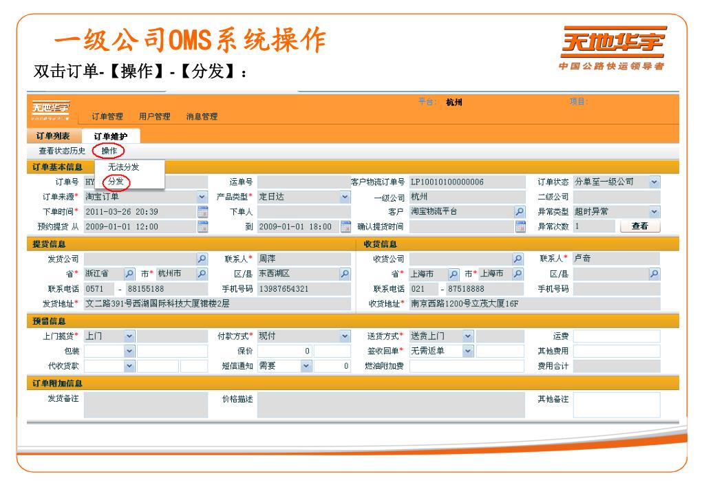 一级公司OMS系统操作 双击订单-【操作】-【分发】: