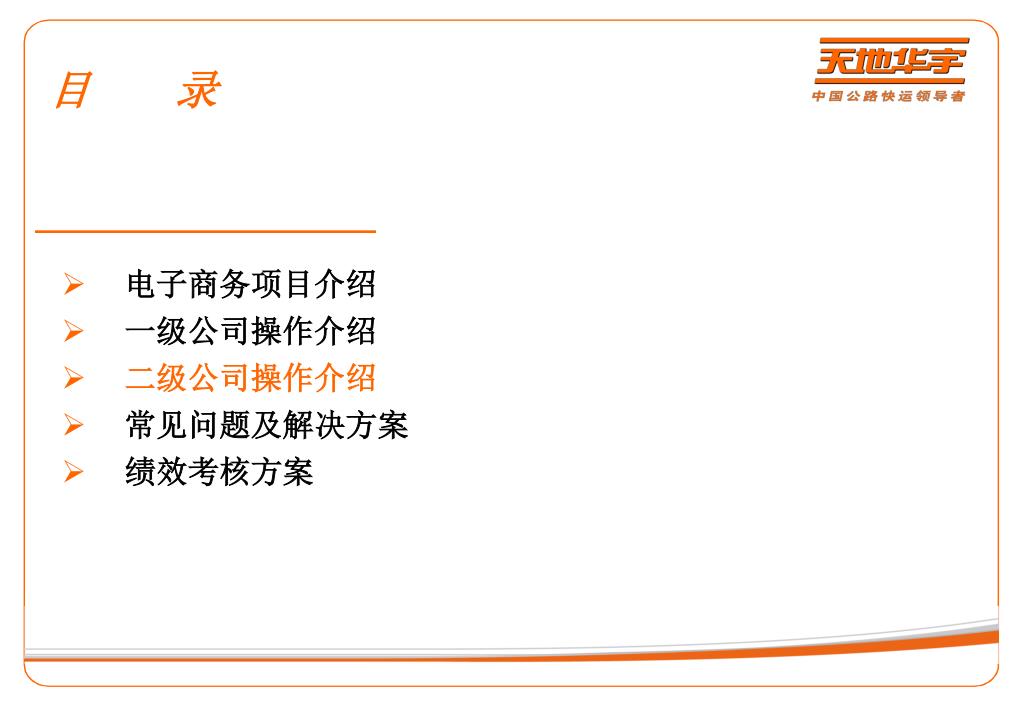 目 录 • 电子商务项目介绍 • 一级公司操作介绍 • 二级公司操作介绍 • 常见问题及解决方案 • 绩效考核方案
