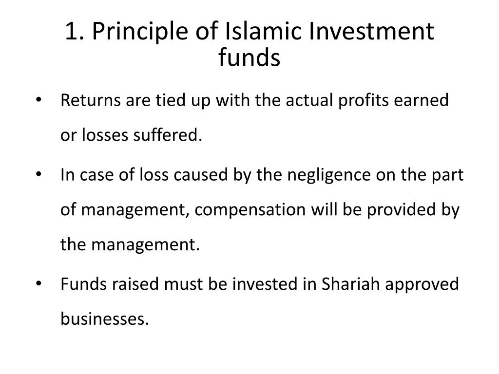 1. Principle of Islamic Investment funds • Returns are tied up with the actual profits earned or losses suffered. • In case of loss caused by the negligence on the part of management, compensation will be provided by the management. • Funds raised must be invested in Shariah approved businesses.
