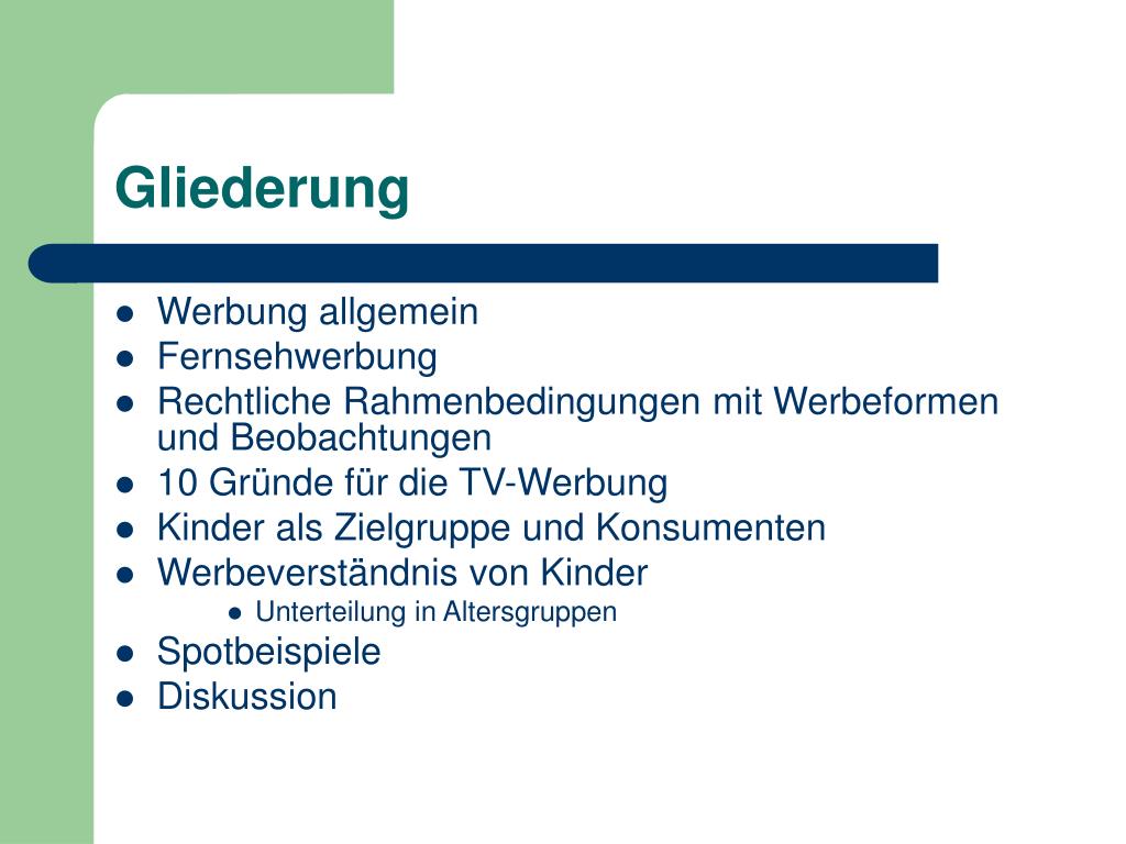 Gliederung • Werbung allgemein • Fernsehwerbung • Rechtliche Rahmenbedingungen mit Werbeformen und Beobachtungen • 10 Gründe für die TV-Werbung • Kinder als Zielgruppe und Konsumenten • Werbeverständnis von Kinder • Unterteilung in Altersgruppen • Spotbeispiele • Diskussion