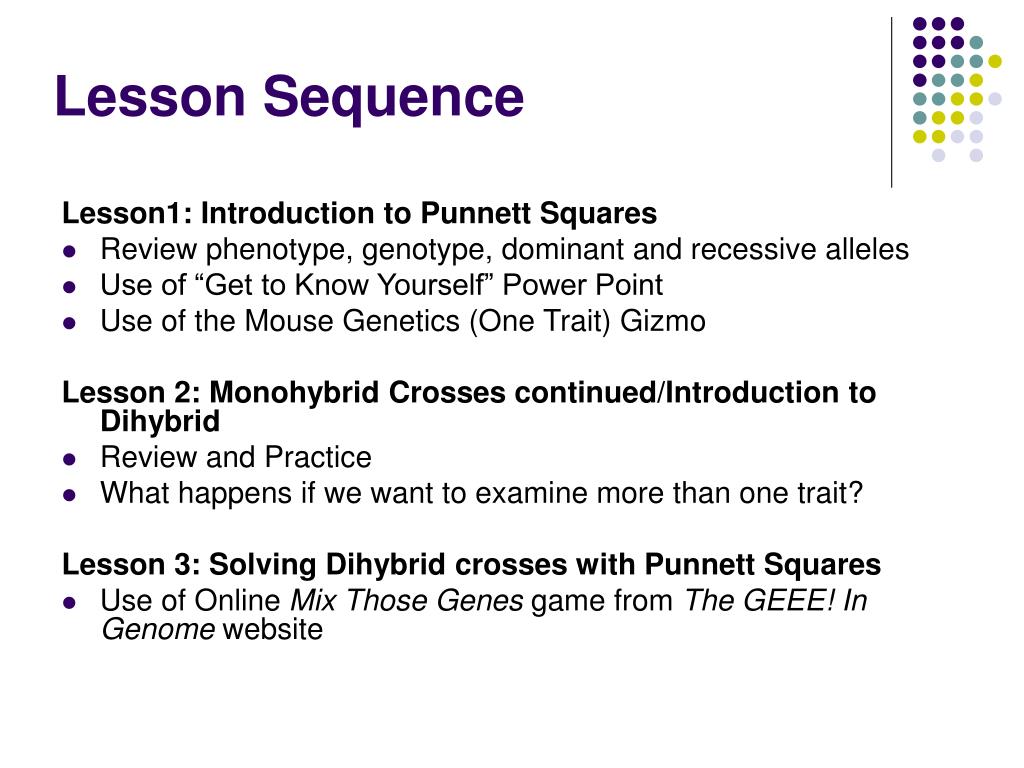 Lesson Sequence Lesson1: Introduction to Punnett Squares • Review phenotype, genotype, dominant and recessive alleles • Use of “Get to Know Yourself” Power Point • Use of the Mouse Genetics (One Trait) Gizmo Lesson 2: Monohybrid Crosses continued/Introduction to Dihybrid • Review and Practice • What happens if we want to examine more than one trait? Lesson 3: Solving Dihybrid crosses with Punnett Squares • Use of Online Mix Those Genes game from The GEEE! In Genome website