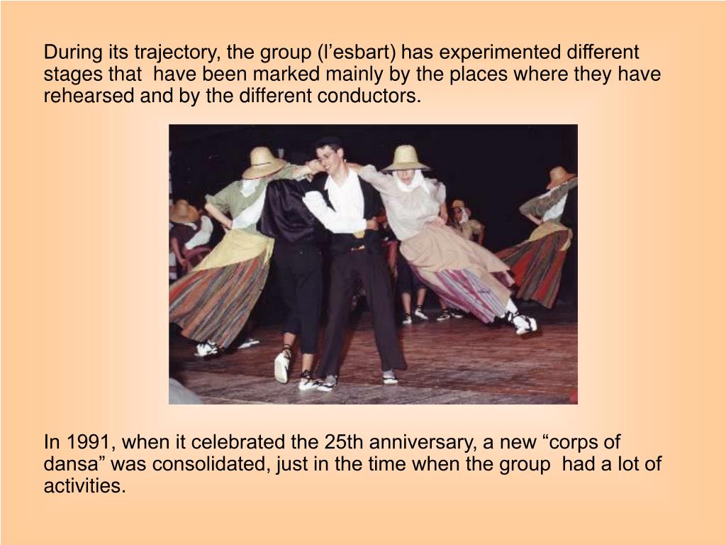 During its trajectory, the group (l’esbart) has experimented different stages that have been marked mainly by the places where they have rehearsed and by the different conductors. In 1991, when it celebrated the 25th anniversary, a new “corps of dansa” was consolidated, just in the time when the group had a lot of activities.