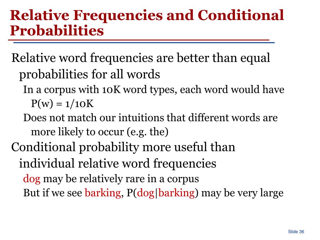 Relative Frequencies and Conditional Probabilities • Relative word frequencies are better than equal probabilities for all words • In a corpus with 10K word types, each word would have P(w) = 1/10K • Does not match our intuitions that different words are more likely to occur (e.g. the) • Conditional probability more useful than individual relative word frequencies • dog may be relatively rare in a corpus • But if we see barking, P(dog|barking) may be very large