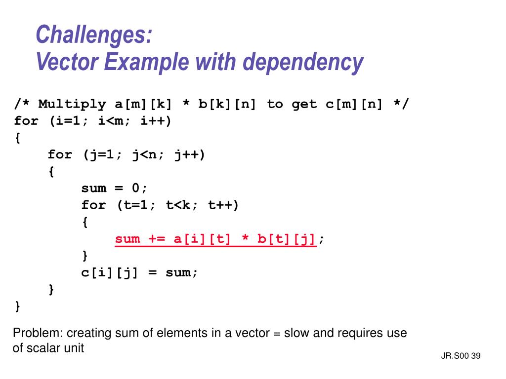 Challenges:Vector Example with dependency /* Multiply a[m][k] * b[k][n] to get c[m][n] */ for (i=1; i<m; i++) { for (j=1; j<n; j++) { sum = 0; for (t=1; t<k; t++) { sum += a[i][t] * b[t][j]; } c[i][j] = sum; } } Problem: creating sum of elements in a vector = slow and requires use of scalar unit