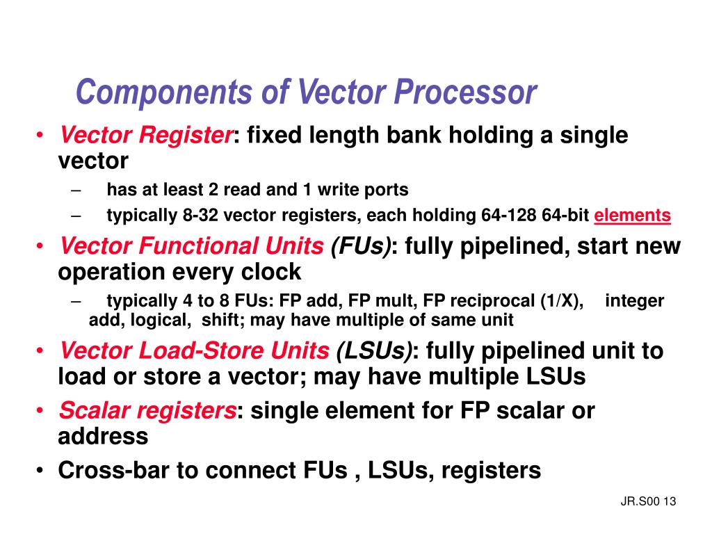 Components of Vector Processor • Vector Register: fixed length bank holding a single vector • has at least 2 read and 1 write ports • typically 8-32 vector registers, each holding 64-128 64-bit elements • Vector Functional Units (FUs): fully pipelined, start new operation every clock • typically 4 to 8 FUs: FP add, FP mult, FP reciprocal (1/X), integer add, logical, shift; may have multiple of same unit • Vector Load-Store Units (LSUs): fully pipelined unit to load or store a vector; may have multiple LSUs • Scalar registers: single element for FP scalar or address • Cross-bar to connect FUs , LSUs, registers