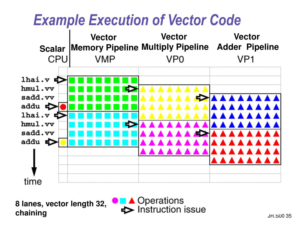 Example Execution of Vector Code Vector Multiply Pipeline Vector Adder Pipeline Vector Memory Pipeline Scalar 8 lanes, vector length 32, chaining
