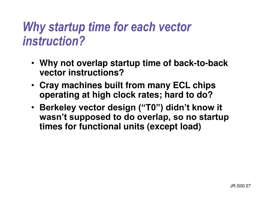 Why startup time for each vector instruction? • Why not overlap startup time of back-to-back vector instructions? • Cray machines built from many ECL chips operating at high clock rates; hard to do? • Berkeley vector design (“T0”) didn’t know it wasn’t supposed to do overlap, so no startup times for functional units (except load)