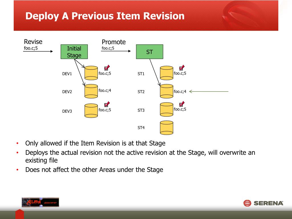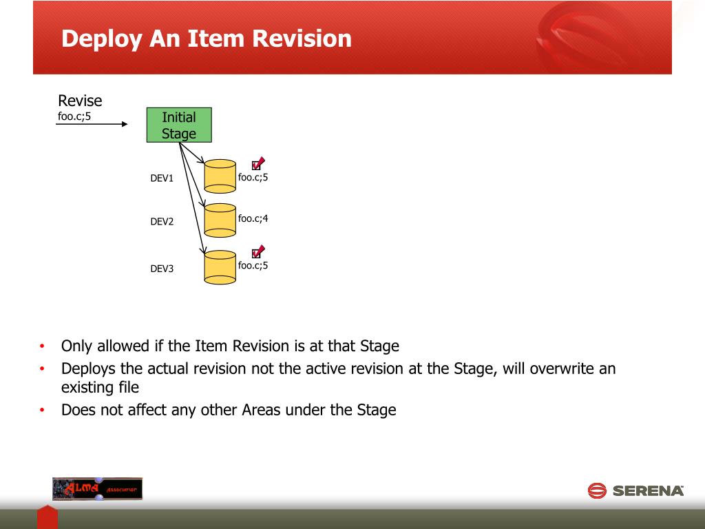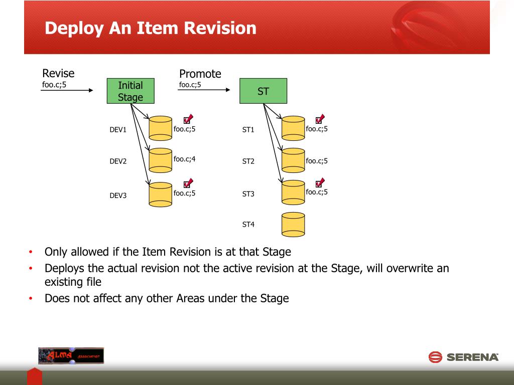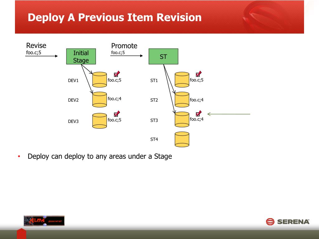 Deploy A Previous Item Revision Revise foo.c;5 Promote foo.c;5 Initial Stage ST foo.c;5 foo.c;5 DEV1 ST1 foo.c;4 foo.c;5 foo.c;4 DEV2 ST2 foo.c;5 foo.c;4 foo.c;5 ST3 DEV3 ST4 • Deploy can deploy to any areas under a Stage