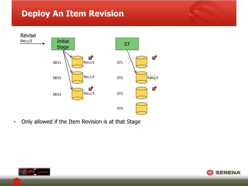 Deploy An Item Revision Revise foo.c;5 Initial Stage ST foo.c;5 DEV1 ST1 foo.c;4 foo.c;5 DEV2 ST2 foo.c;5 ST3 DEV3 ST4 • Only allowed if the Item Revision is at that Stage