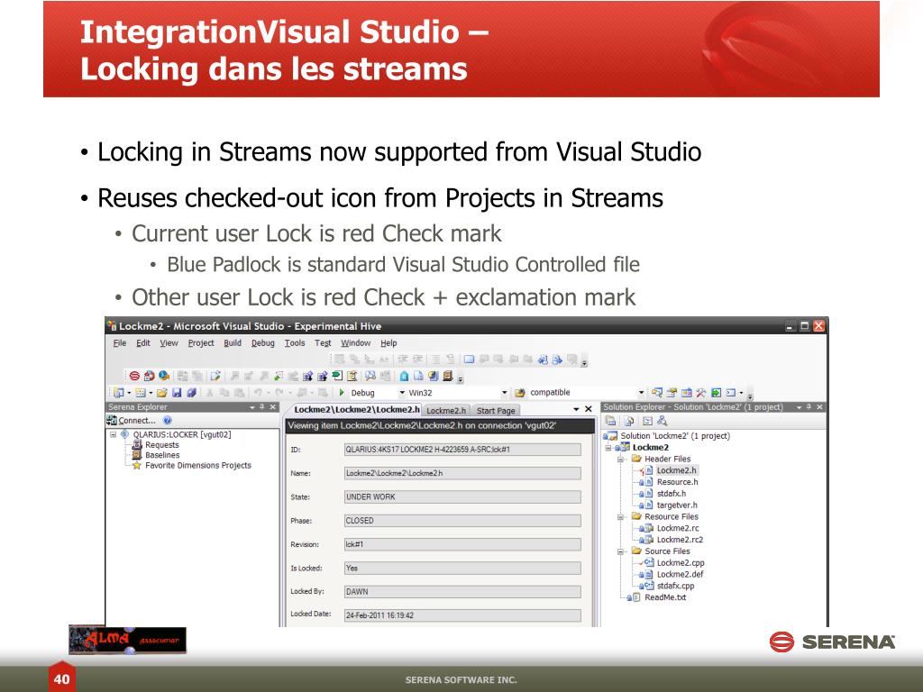 IntegrationVisualStudio –Locking dans les streams • Locking in Streams now supported from Visual Studio • Reuses checked-out icon from Projects in Streams • Current user Lock is red Check mark • Blue Padlock is standard Visual Studio Controlled file • Other user Lock is red Check + exclamation mark SERENA SOFTWARE INC.