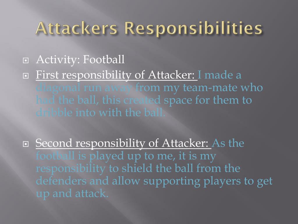 Attackers Responsibilities • Activity: Football • First responsibility of Attacker: I made a diagonal run away from my team-mate who had the ball, this created space for them to dribble into with the ball. • Second responsibility of Attacker: As the football is played up to me, it is my responsibility to shield the ball from the defenders and allow supporting players to get up and attack.