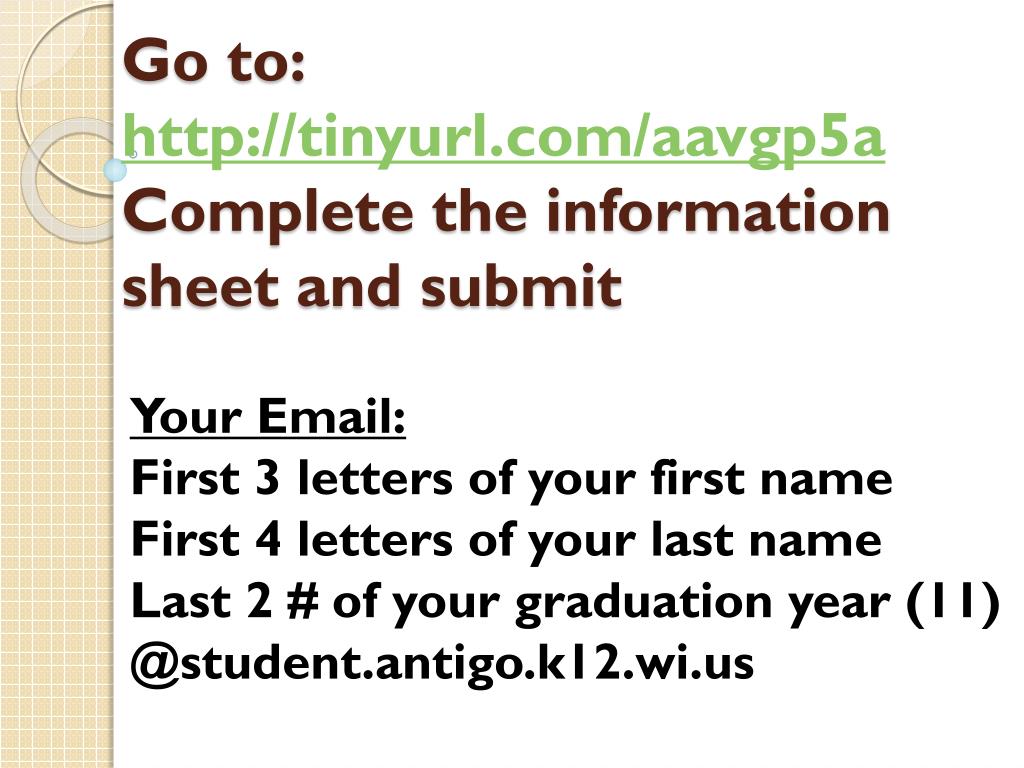 Go to:http://tinyurl.com/aavgp5aComplete the information sheet and submit Your Email: First 3 letters of your first name First 4 letters of your last name Last 2 # of your graduation year (11) @student.antigo.k12.wi.us